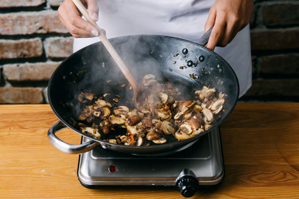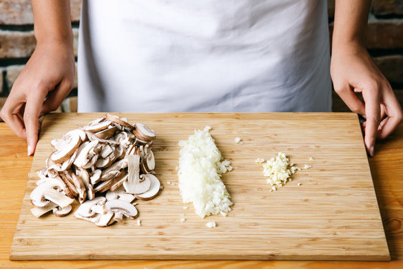 Inzwischen die Pilze mit etwas Küchenkrepp oder einer Bürste von evtl. Dreck befreien und in feine Scheiben schneiden. Die Zwiebel schälen und fein hacken. Den Knoblauch schälen und fein hacken.