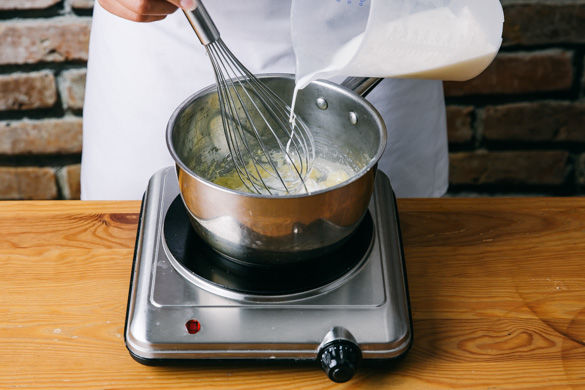 In einem kleinen Topf die Butter auf niedriger bis mittlerer Hitze schmelzen lassen, dann mit 2EL Mehl bestäuben und nach und nach die Milch mit einem Schneebesen einrühren, ggfs. 100ml Wasser hinzufügen. Mit Salz, Pfeffer und nach Geschmack mit Muskatnuss abschmecken.