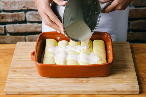 Zum Schluss die Hälfte der Sauce in der Auflaufform verstreichen. Die Füllung gleichmäßig auf die Lasagnenblätter verteilen, aufrollen und mit der Falst nach unten in die Form legen, mit restlicher Béchamel-Sauce bedecken und für ca. 10-15Min. im Ofen rösten. Ein paar Petersilienblätter aufheben, den Rest fein hacken und Nudelrollen damit garniert servieren.