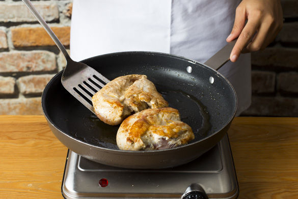 Die Hähnchen in einer mittelhoch erhitzten, ofenfesten großen Pfanne ca. 1-2Min. von jeder Seite anbraten und dann für ca. 7-9Min. mit in den Ofen geben.
