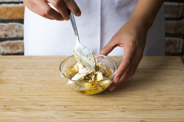 In der Zwischenzeit, die Hähnchenbrustfilets mit dem Gewürz und 1-2EL Olivenöl mischen.