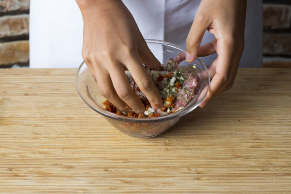 Inzwischen die getrockneten Tomaten fein hacken. Das Hackfleisch mit den restlichen Zwiebeln und Knoblauch, den getrockneten Tomaten sowie Salz, Pfeffer und restlichem Gewürz abschmecken.