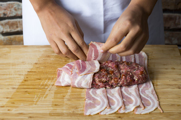 Die Baconscheiben leicht überlappend nebeneinander legen und die Hackmasse in einer Rolle darauf verteilen. Die Baconscheiben an den Enden einklappen, dann den Rest über Kreuz darüber legen. Mit Falst nach unten in eine Auflaufform legen, die Tomatensauce drumherum gießen und für ca. 20-25Min. im Ofen knusprig garen, bis die Mitte des Bratens gar ist.