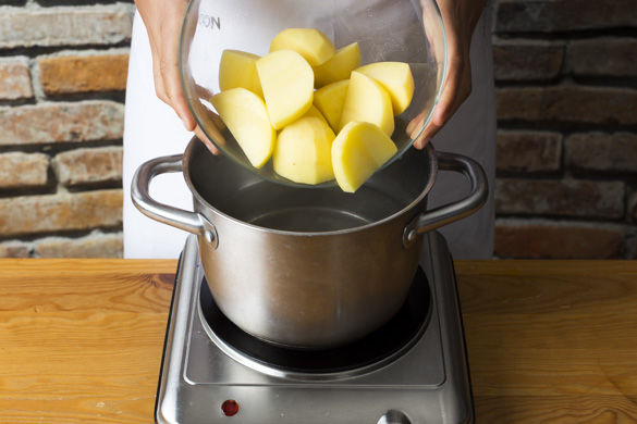 Inzwischen in einem großen Topf ausreichend leicht gesalzenes Wasser für die Kartoffeln zum Kochen bringen. Die Kartoffeln schälen und je nach Größe vierteln oder achteln, dann im kochenden Wasser ca. 20-25Min. weich kochen.