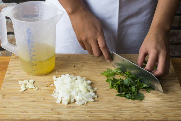 In einem Wasserkocher 270ml Wasser aufkochen und die Hälfte des Brühwürfels darin auflösen. Die Zwiebel schälen, halbieren und in feine Würfel schneiden. Den Knoblauch ebenso schälen und in feine Scheiben schneiden. Die Petersilie samt Stängel schneiden.