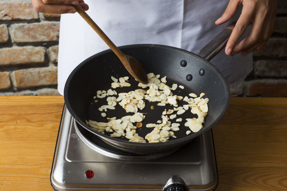 Inzwischen die Mandelblättchen trocken in einer kleinen Pfanne bei mittlerer Hitze ca. 2-3Min. goldbraun rösten. Vorsicht! Die Mandeln können schnell anbrennen.