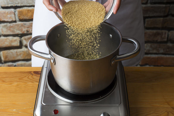 Die Hälfte der Zwiebeln mit 1-2EL Olivenöl in einem mittleren Topf ca. 1-2Min. glasig dünsten. Dann mit der Gemüsebrühe ablöschen und den Couscous einrieseln lassen. Zugedeckt ca. 6-8Min. ziehen lassen.