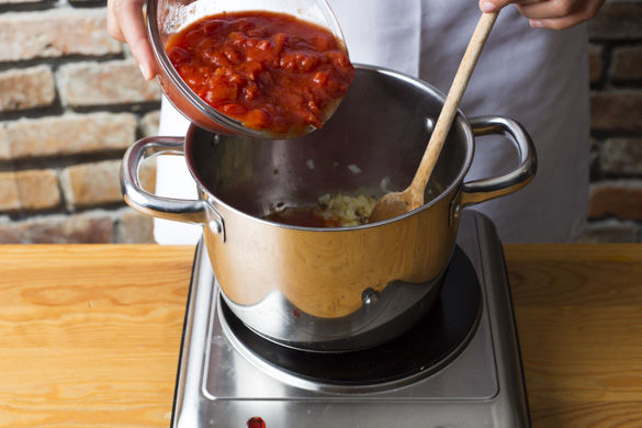 Den Safran (ggf. im Mörser zermahlen) dazu geben und mit den Tomaten ablöschen, den restlichen Brühwürfel hinzufügen und alles für ca. 5-6Min. köcheln lassen. Mit Salz, Pfeffer und etwas Zucker abschmecken.