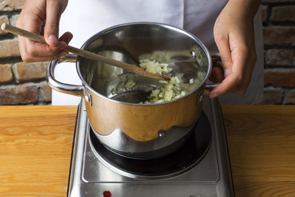 Nun die restlichen Zwiebeln mit dem Knoblauch und 1-2EL Olivenöl ca. 1-2Min. glasig in einem großen Topf anschwitzen.