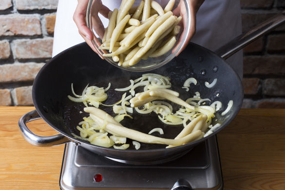 In einer großen Pfanne 1-2EL Olivenöl mittelhoch erhitzen und die Zwiebeln und Knoblauch für ca. 1-2Min. anschwitzen, dann die Schupfnudeln hinzufügen und für ca. 6-10Min. goldbraun anbraten.