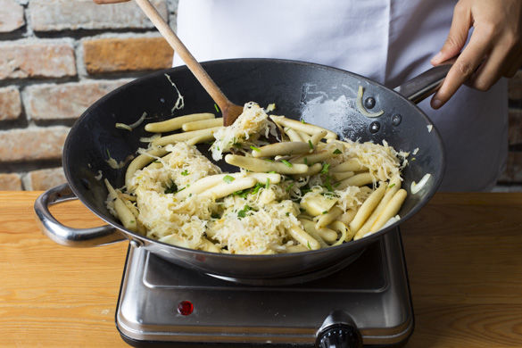 Die Butter, nach Geschmack mit dem restlichen Sauerkraut und die restlichen Kräuter unter die Schupfnudeln mischen und alles mit Salz und Pfeffer abschmecken.