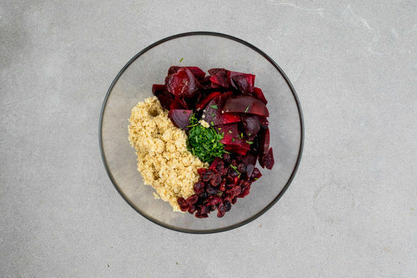 Heute wartet ein besonders feines Rezept auf dich. Lockere Quinoa wird mit marinierter Rote Bete und getrockneten Cranberrys vermischt. Dazu gibt es ein cremiges Kräuterdressing, knusprig gebackenen Fetakäse und geröstete Walnüsse. Eine bunte Verführung für deine Sinne!