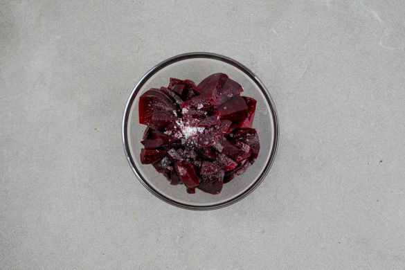 Inzwischen die Rote Bete längs vierteln und schräg in dünne Scheiben schneiden. Die Rote-Bete-Scheiben mit 2EL Essig und je 1 Prise Salz und Zucker vermischen und zum Marinieren beiseitestellen, dabei gelegentlich umrühren. Tipp: Da Rote Bete stark färbt, am besten Handschuhe und Schürze tragen.