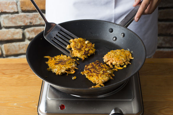 In einer großen Pfanne auf mittlerer Hitze 1-2EL Olivenöl erwärmen und mit einem Esslöffel Portionen vom Teig abstechen und in der Pfanne flach drücken, ca. 2-3Min. von jeder Seite braten. Die Rösti auf einem Rost oder Küchenkrepp legen, um überschüssiges Fett abtropfen zu lassen. So lange weitermachen, bis der Teig aufgebraucht ist.
