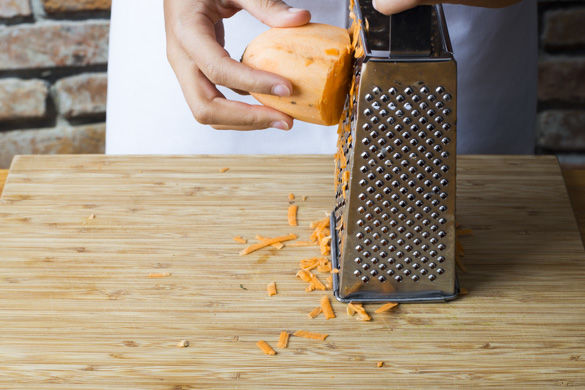 Die Süßkartoffel schälen und mit der groben Seite der Küchenreibe raspeln. Den Knoblauch schälen und fein hacken.