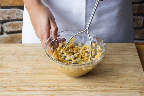 Die Kichererbsen gut abtropfen lassen und mit einem Kartoffelstampfer stampfen, bis sie zu einem Püree geworden sind.