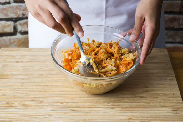 Nun die Eier mit Knoblauch, Gewürz, ordentlich Salz und Pfeffer sowie Speisestärke mit den gestampfen Kichererbsen und Süßkartoffel mischen. Tipp: Falls die Masse noch zu feucht ist, etwas Mehl hinzufügen.