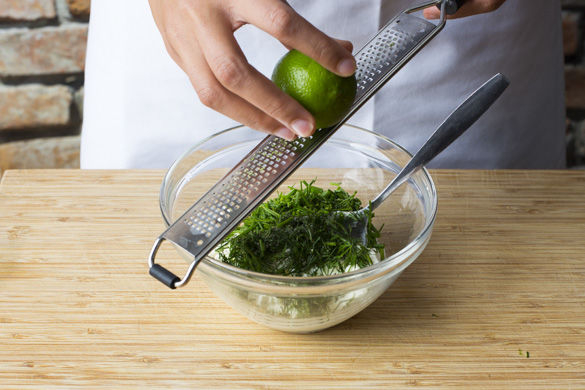 Inzwischen die Schale der Limette abreiben, den Rest in Spalten schneiden. Den Dill vom Stängel zupfen und mit dem Schnittlauch fein hacken. Alles in einer Schale mit Quark mischen und mit Salz und Pfeffer abschmecken.