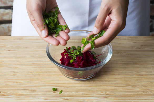Zum Schluss die Rote Beete schälen und grob raspeln. Tipp: Da Rote Beete stark färbt, am besten mit Handschuhen und Schürze arbeiten. Die Petersilie samt Stängel fein hacken. Die Rote Beete mit Rucola und Petersilie sowie frischem Limettensaft aus den Spalten und Salz mischen. Zu den Rösti und Quark servieren.