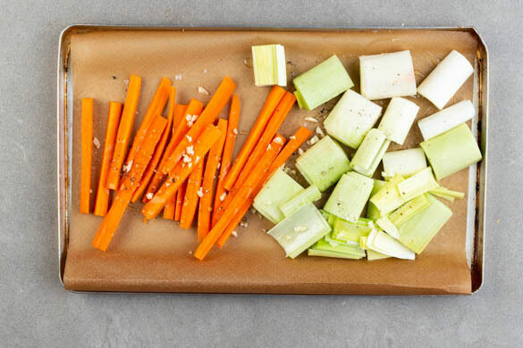 Den Knoblauch schälen und fein würfeln. Den Lauch längs halbieren und in ca. 5cm große Stücke schneiden, die Karotte ggf. schälen, längs halbieren und in dünne, pommesartige Stifte schneiden. Auf einem mit Backpapier ausgelegten Backblech mit 1EL Olivenöl, der ½ des Knoblauchs sowie je 1 kräftigen Prise Salz und Pfeffer vermengen. Im Ofen in 15–17Min. goldbraun und weich backen.