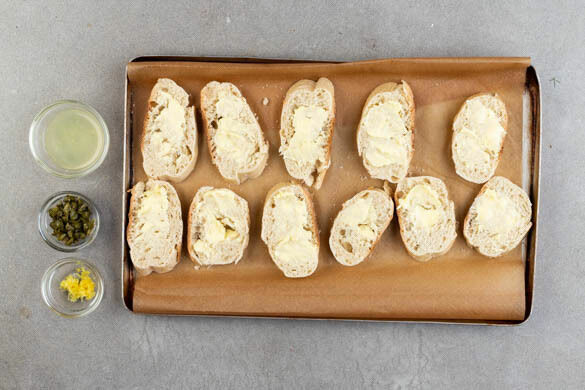 1 Brötchen in ca. 1cm dicke Scheiben schneiden und auf ein zweites mit Backpapier ausgelegtes Backblech geben. Die weiche Butter mit dem restlichen Knoblauch sowie je 1 Prise Salz und Pfeffer verrühren und auf das Brot streichen. Das Brot im Ofen in 8–10Min. goldbraun rösten. Die Kapern grob hacken. Die Zitronenschale abreiben, dann die Zitrone halbieren und auspressen.