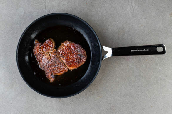 Das Fleisch trocken tupfen und von beiden Seiten großzügig mit Salz und Pfeffer würzen. Das Fleisch in einer großen Pfanne mit 1EL Olivenöl bei starker Hitze 3–4Min. auf jeder Seite braten, dann auf einem Teller abgedeckt 5–8Min. ruhen lassen.