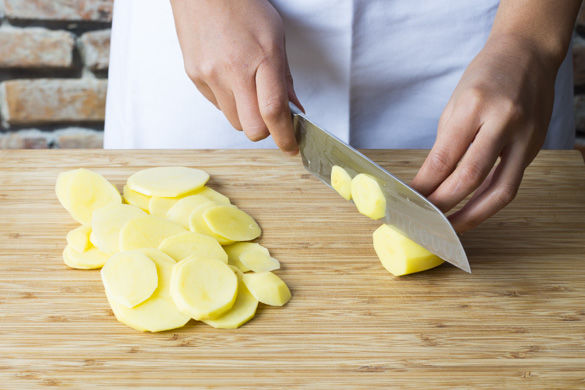 Die Kartoffeln nach Wunsch schälen und dann in möglichst dünne Scheiben schneiden oder hobeln.
