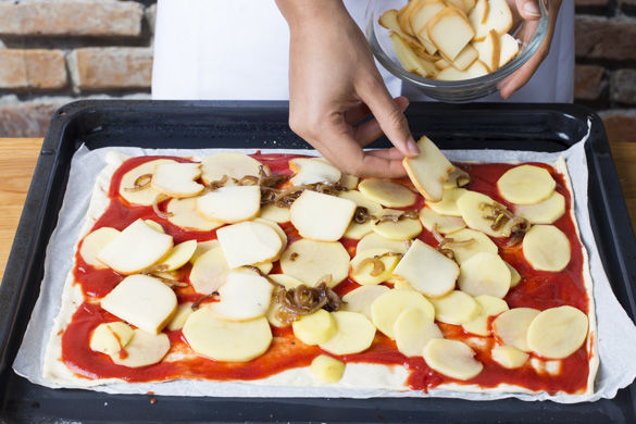 Den Pizzateig samt Papier auf ein Backblech ausrollen. Mit passierten Tomaten bestreichen, mit Salz und Pfeffer würzen und gleichmäßig mit Kartoffelscheiben und Zwiebeln belegen, dann den Käse drauf verteilen. Für ca. 15-18Min. im Ofen auf mittlerer Schiene backen, bis der Teig am Rand goldbraun und die Kartoffeln in der Mitte gar sind.