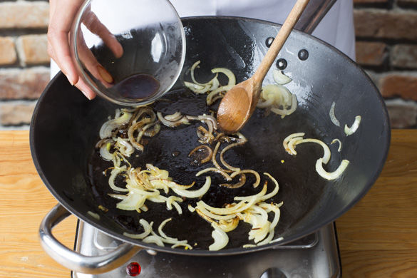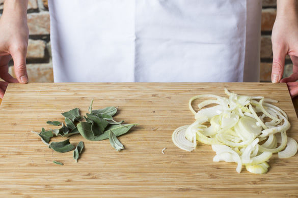 Den Ofen auf 220°C Umluft vorheizen. Die Zwiebeln schälen, halbieren und in feine Streifen schneiden. Den Salbei vom Stängel abzupfen.