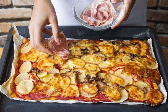 Pancetta ist eine italienische Variante des Bauchspecks vom Schwein, der regional unterschiedlich mit Kräutern gewürzt, gesalzen und luftgetrocknet wird. Gelegentlich wird Pancetta aber auch leicht geräuchert - Heute gibt es diesen bei dir als i-Tüpfelchen auf einer herzhaft belegten Kartoffelpizza mit Käse und frittierten Salbeiblättern.