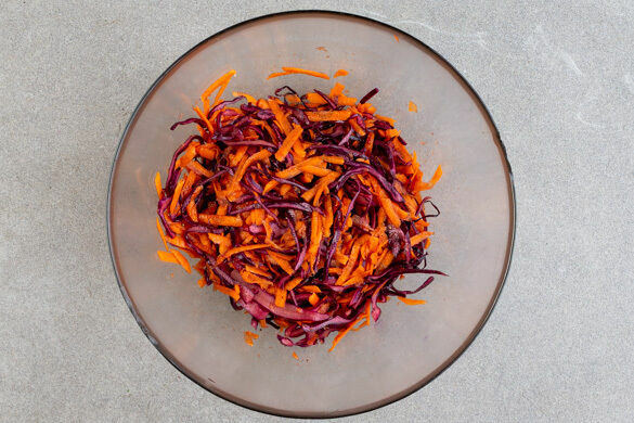 Den Rotkohl mit 1 kräftigen Prise Salz 2–3Min. durchkneten, bis der Kohl weich wird. Dabei am besten Küchenhandschuhe tragen. Die Karotten, den Ingwer, 1EL Pflanzenöl und 2EL hellen Essig untermengen und den Salat mit 1–2EL Sojasauce, ½TL Zucker sowie Salz und Pfeffer nach Geschmack würzen.