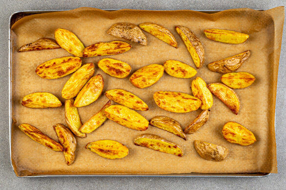 Den Backofen auf 240°C (220°C Umluft) vorheizen. Die Kartoffeln samt Schale vierteln und auf einem mit Backpapier ausgelegten Backblech verteilen. Die Kartoffeln mit 2EL Olivenöl, 1TL Salz und 1 kräftigen Prise Pfeffer vermengen und 20–25Min. im Ofen backen, bis sie goldbraun sind. Nach ca. 15Min. Backzeit einmal wenden.