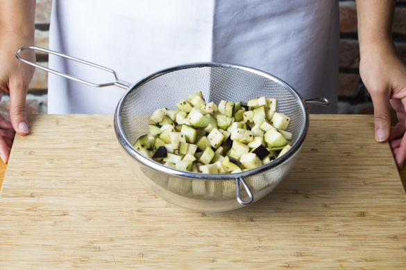 Den Backofen auf Umluftfunktion auf 220°C vorheizen. Die Aubergine längs vierteln und anschließend in ca. 0,5cm-1cm große Würfel schneiden. Großzügig mit Salz einreiben, in ein Sieb geben und zum Abtropfen zur Seite stellen.