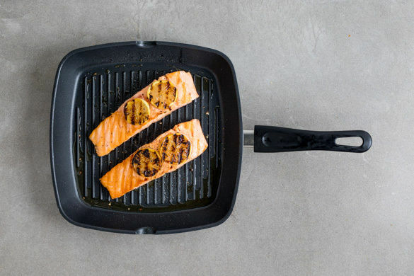 Den Lachs mit kaltem Wasser abspülen und evtl. vorhandene Gräten mit einer Pinzette entfernen. Von beiden Seiten mit insgesamt 2EL Olivenöl sowie Salz und Pfeffer einreiben. In eine bei mittlerer Hitze erwärmte Grillpfanne oder normale Pfanne geben, mit den Zitronenscheiben belegen und 3–4Min. anbraten. Mit den Zitronenscheiben wenden und weitere 3–4Min. braten.
