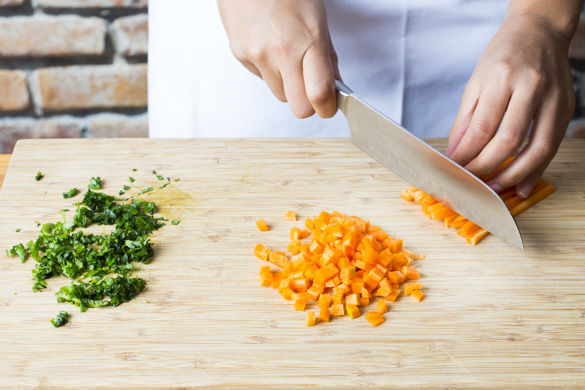 Die Karotten schälen, längs in möglichst feine Scheiben und dann in kleine Würfel schneiden. Den Basilikum vom Stängel zupfen und fein hacken.
