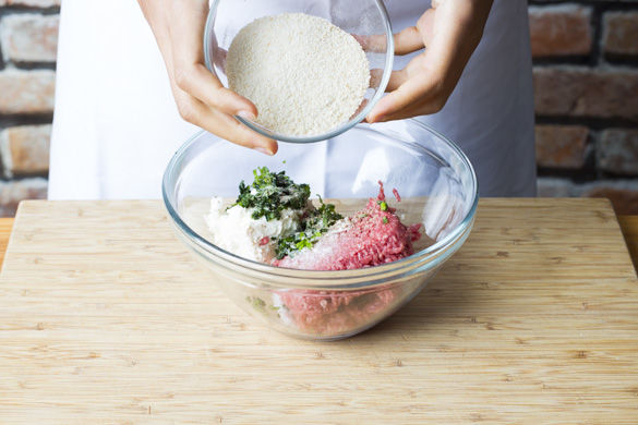 Den Ricotta, Hackfleisch und Basilikum miteinander vermengen und die Semmelbrösel untermischen, bis es eine formbare Masse gibt. Alles mit Salz und Pfeffer abschmecken. Nun ca. 12-14 golfballgroße Bällchen formen.
