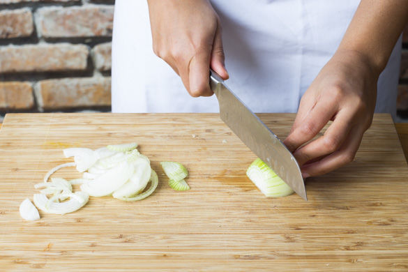 Den Ofen auf 230°C Umluft oder 250°C Ober-/Unterhitze vorheizen. Die Zwiebel schälen, halbieren und in feine Streifen schneiden.