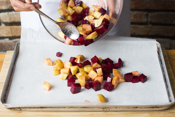 Die Rote Beete schälen und mit den Kartoffeln in ca. 1,5cm große Würfel schneiden. Tipp: Da Rote Beete stark färbt, am besten mit Handschuhen und Schürze arbeiten. Mit 1-2EL Olivenöl, Salz und Pfeffer vermengen und auf ein mit Backpapier ausgelegtes Backblech legen, für ca. 15-20Min. im Ofen garen.