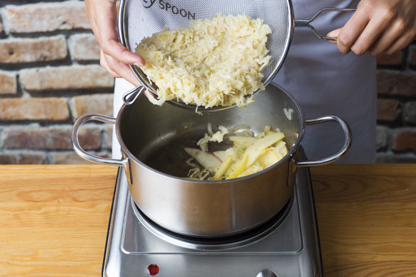 Den Apfel vierteln und vom Kerngehäuse befreien, dann in feine Scheiben schneiden. Das Sauerkraut gut abtropfen lassen.