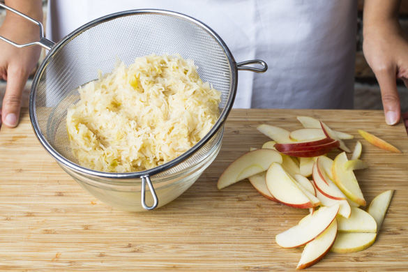 Den Apfel vierteln und vom Kerngehäuse befreien, dann in feine Scheiben schneiden. Das Sauerkraut gut abtropfen lassen.