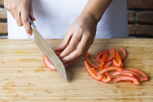 Die Tomate vierteln und von den Kernen befreien, dann in feine Streifen schneiden.