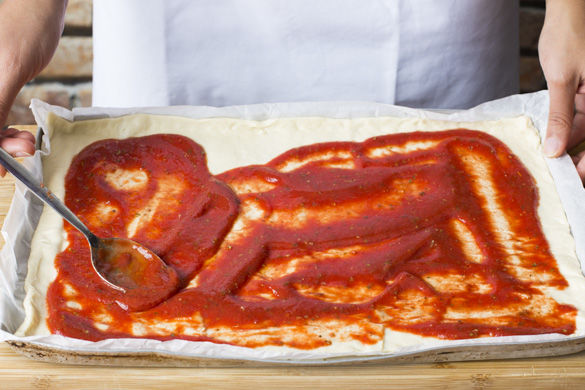 Den Teig mit Papier auf ein Backblech ausrollen und mit Tomatensauce bestreichen.