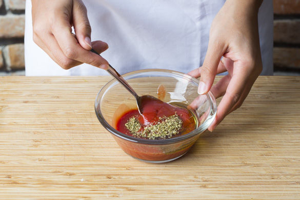 Den Ofen auf 230°C Umluft oder 250°C Ober-/Unterhitze vorheizen. Die passierten Tomaten mit 1-2EL Olivenöl, Oregano, Salz und Pfeffer verrühren.