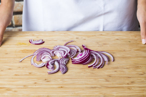 Die Zwiebel schälen, halbieren und in feine Streifen schneiden.