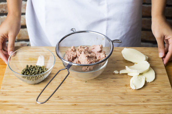 Den Thunfisch und die Kapern in einem Sieb abtropfen lassen. Den Mozzarella ebenfalls abtropfen lassen und in feine Scheiben schneiden.