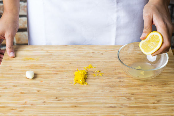 In einem mittelgroßen Topf ausreichend gesalzenes Wasser für die Pasta zum Kochen bringen. Den Knoblauch schälen. Die Schale der Zitrone abreiben und Zitrone entsaften.
