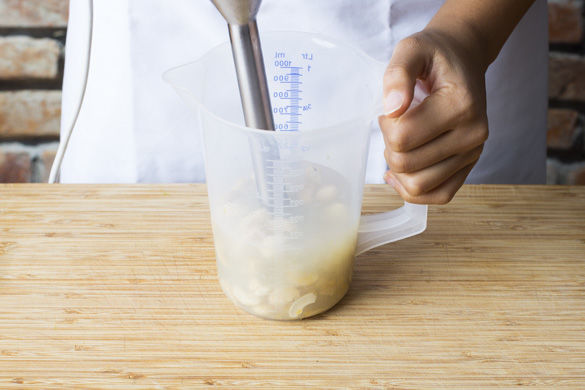 Den Knoblauch mit der Hälfte des Zitronenabriebs, 2EL Zitronensaft, Miso, Cashews und 250-300ml Wasser in einem hohen Gefäß mischen und mithilfe eines Stabmixers zu einer Sauce pürieren, ggfs. etwas mehr Wasser hinzufügen.