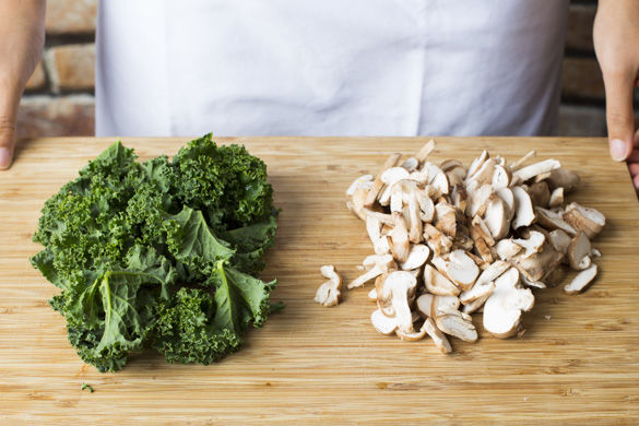 Die harten Stängel des Grünkohls entfernen und den Grünkohl in mundgerechte Stücke zupfen. Die Pilze mit etwas Küchenkrepp oder einer Bürste von evtl. Dreck befreien und in dünne Scheiben schneiden.