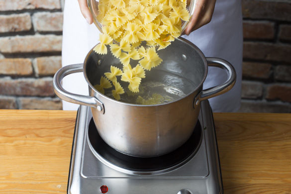Sobald das Wasser kocht, die Pasta für ca. 10-12Min. bissfest kochen, ca. 100ml Pastawasser abfangen und den Rest abgießen, kalt abschrecken.