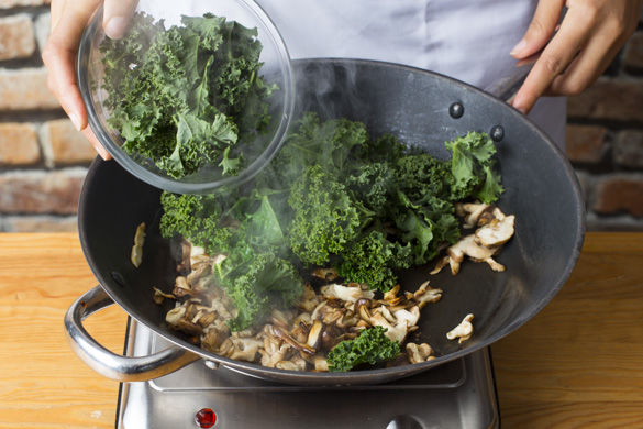 Inzwischen in einer großen Pfanne 1-2EL Pflanzenöl auf hoher Hitze erwärmen und die Pilze für ca. 2-3Min. darin anbraten, dann den Grünkohl hinzufügen und weitere ca. 3-4Min. mitbraten, oder bis er eingefallen ist. Mit Salz und Pfeffer abschmecken.